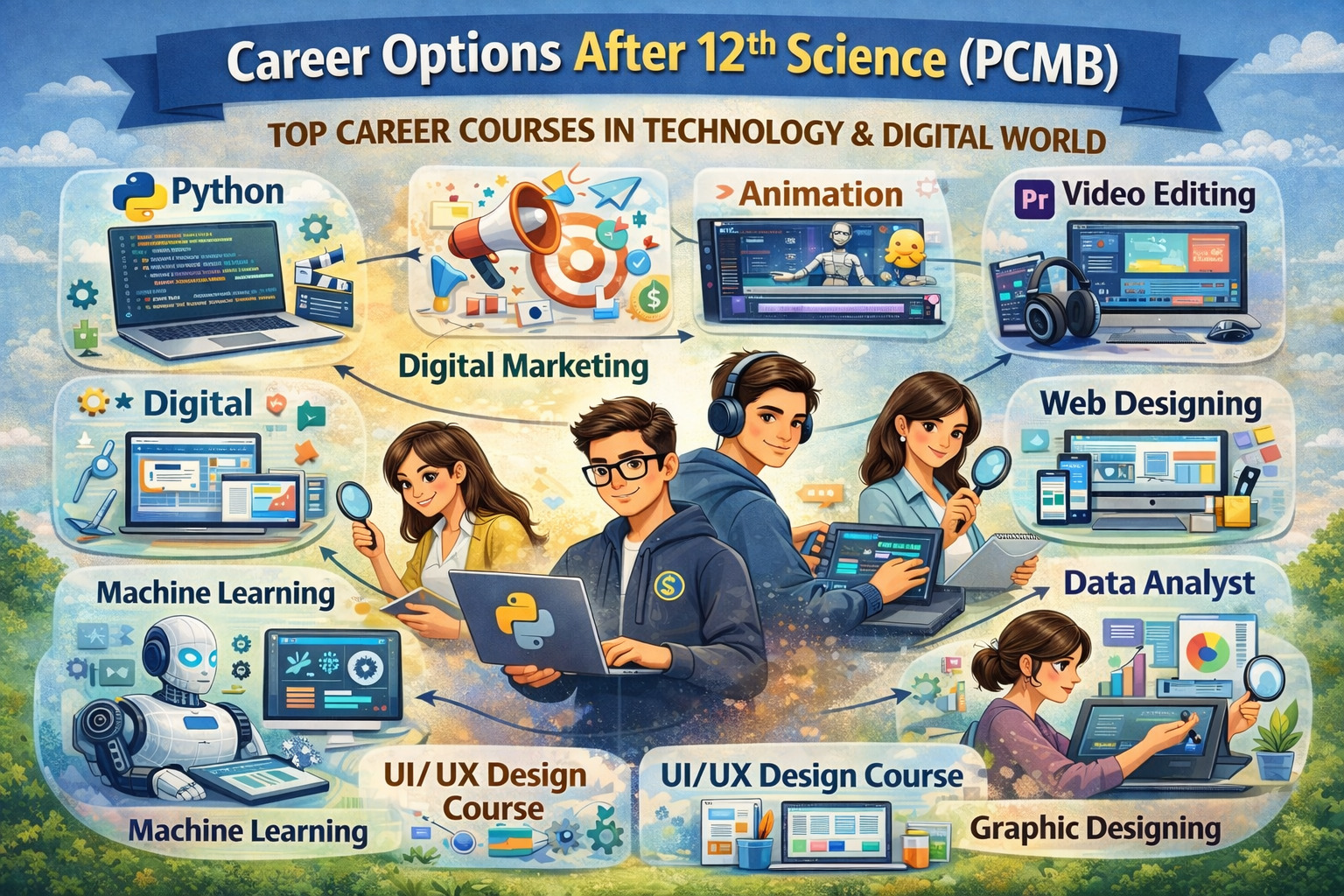 After completing 12th Science with PCMB, students have multiple career opportunities beyond traditional paths. Professional courses such as Digital Marketing, Python, Machine Learning, UI/UX Design, Data Analytics, Animation, and Graphic Designing provide practical knowledge, strong career growth, and global job opportunities. These skill-based programs help students become industry-ready, improve employability, and achieve long-term professional success. Choosing the right course based on your interest and career goals will help you build a stable and future-ready career.