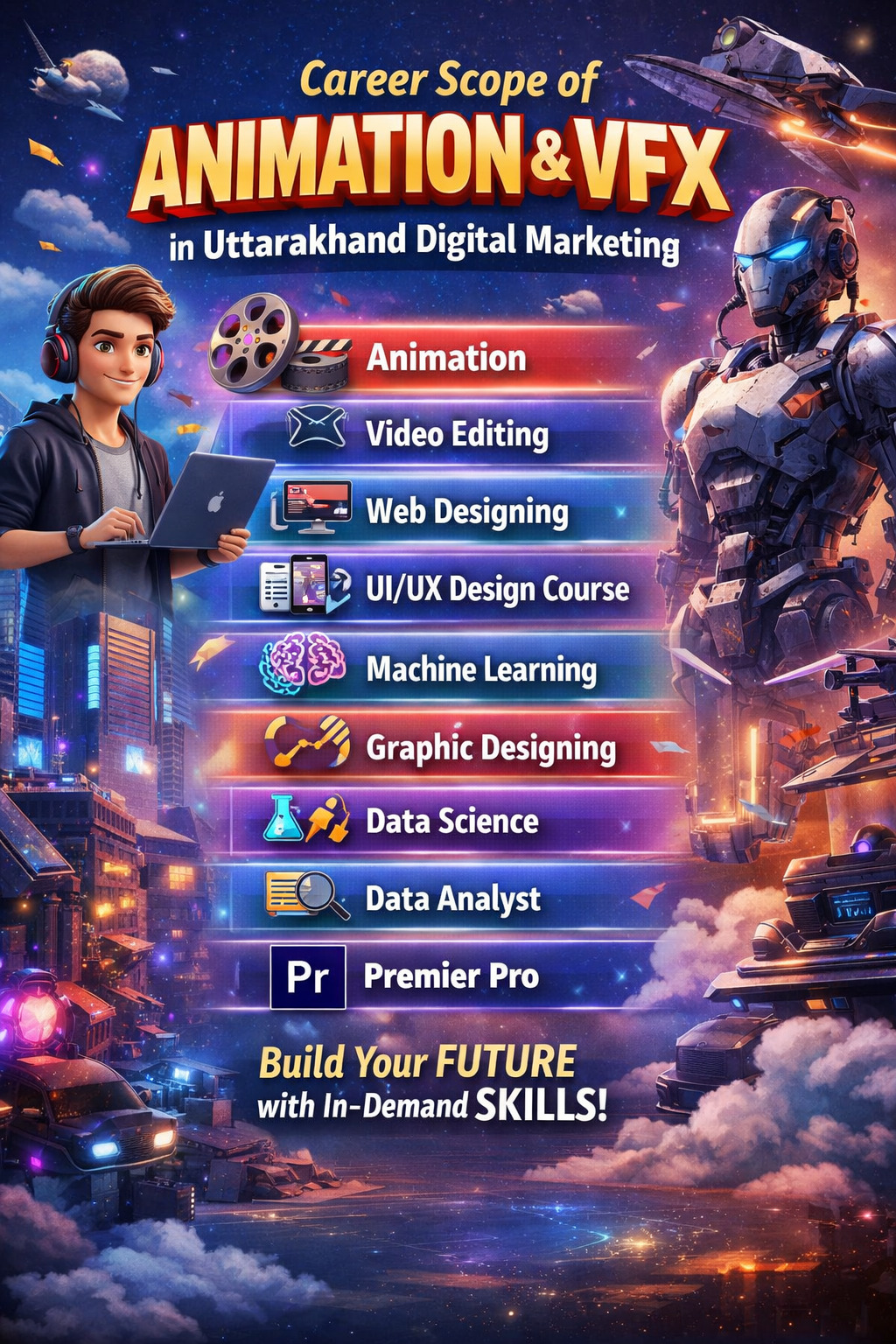 The animation and VFX industry offers promising career opportunities for students in Uttarakhand. With the increasing demand for digital media, films, advertising, and online content, skilled professionals in animation and visual effects are highly valued. By learning courses such as Digital Marketing, Python, Animation, Video Editing, Web Designing, UI/UX Design, Machine Learning, Graphic Designing, Data Analysis, and Premiere Pro, students can develop both creative and technical skills needed for successful careers in the modern digital world.