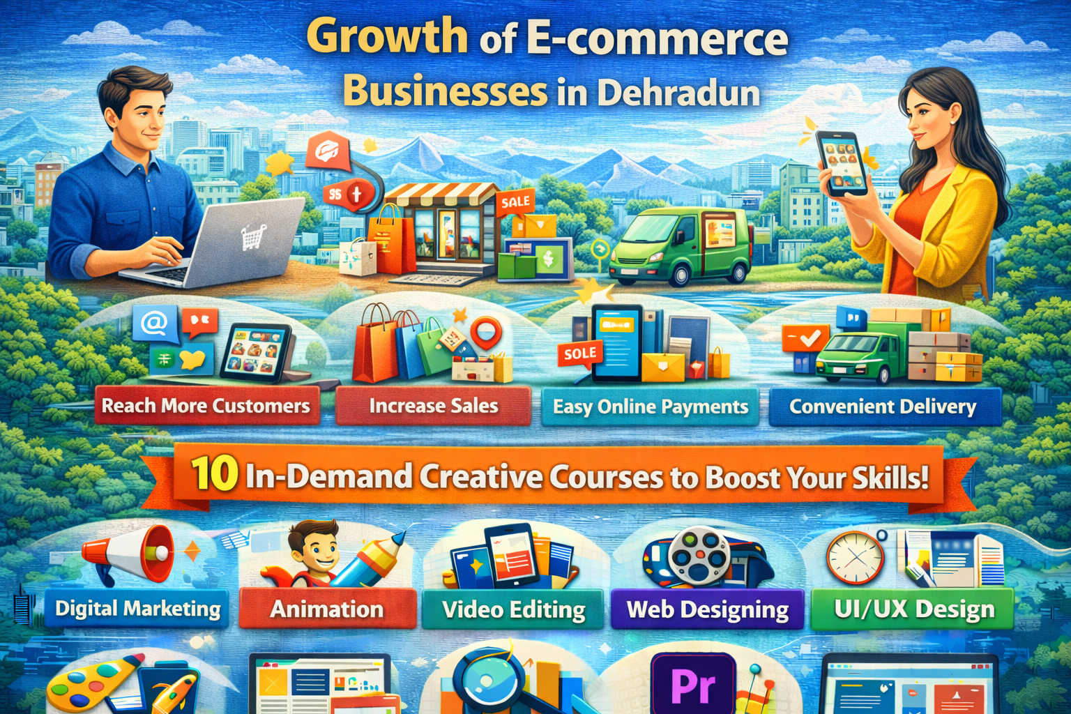 The growth of e-commerce businesses in Dehradun has created exciting opportunities for both entrepreneurs and skilled professionals. As more businesses move online, the demand for experts in digital marketing, web design, graphic design, and data analysis continues to rise. Students who learn courses such as Digital Marketing, Python, Animation, Video Editing, Web Designing, UI/UX Design, Machine Learning, Graphic Designing, Data Analysis, and Premiere Pro can play an important role in supporting the digital growth of businesses while building successful careers in the modern digital economy.