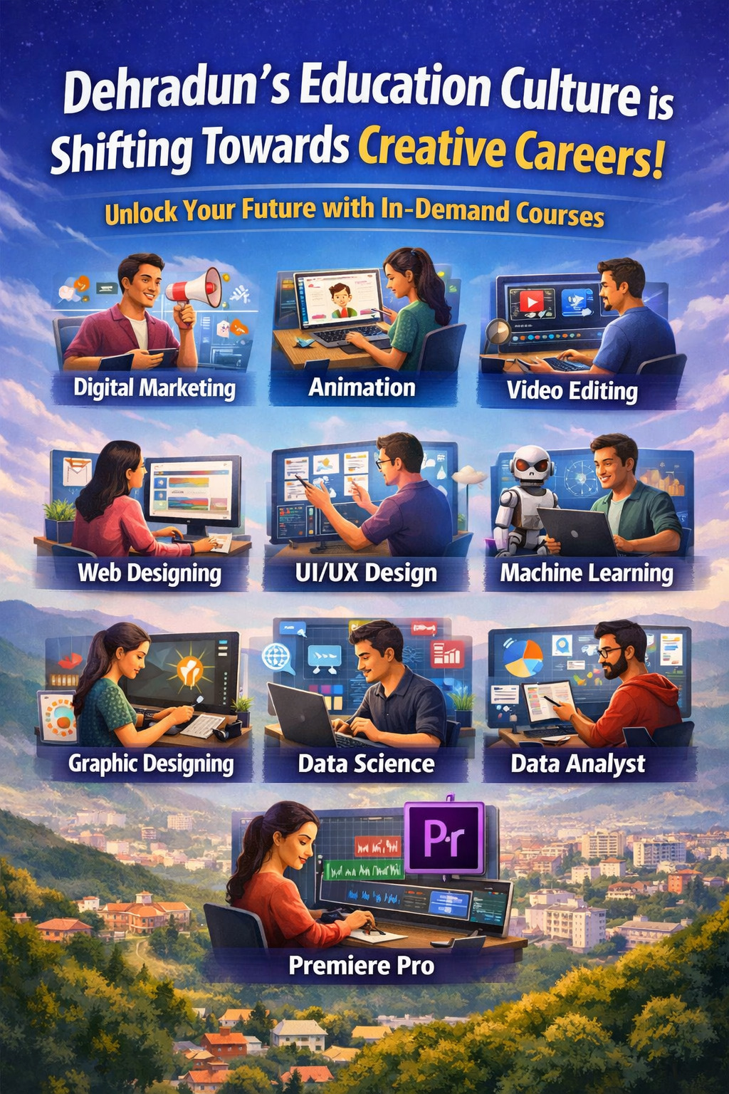 The education culture in Dehradun is gradually shifting toward creative and technology-based careers. Students are now focusing on practical skills that help them adapt to the modern digital world. By learning professional courses such as Digital Marketing, Python, Animation, Video Editing, Web Designing, UI/UX Design, Machine Learning, Graphic Designing, Data Analysis, and Premiere Pro, students can develop valuable expertise and build successful careers in creative and digital industries.