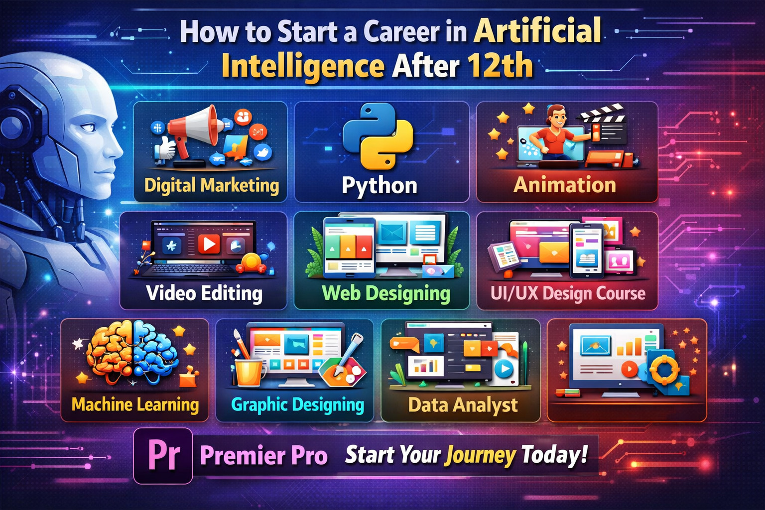 Starting a career in Artificial Intelligence after 12th is a smart decision for students who want to build a future-ready career. With the increasing demand for AI professionals, learning the right skills early can provide a strong advantage. Courses such as Digital Marketing, Python, Animation, Video Editing, Web Designing, UI/UX Design, Machine Learning, Graphic Designing, Data Analysis, and Premiere Pro help students develop both technical and creative skills. By focusing on practical learning and staying consistent, students can achieve success in the growing AI industry.