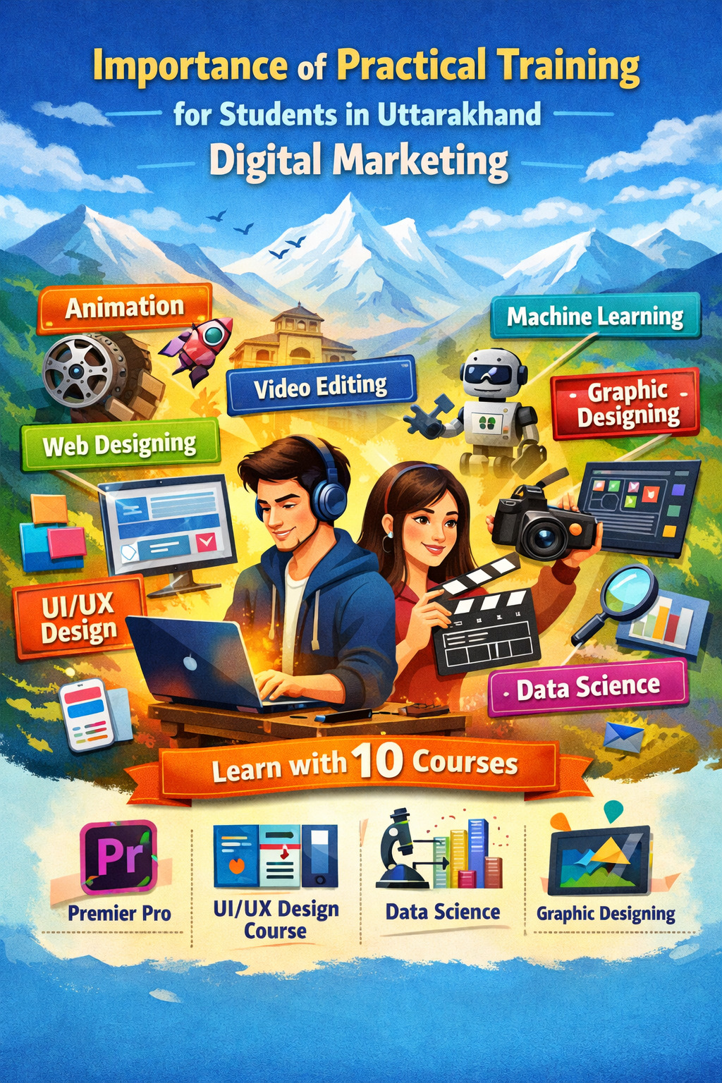 Practical training plays a crucial role in shaping successful careers for students in Uttarakhand. As industries continue to adopt digital technologies, companies are looking for professionals who have hands-on experience and practical skills. Courses such as Digital Marketing, Python, Animation, Video Editing, Web Designing, UI/UX Design, Machine Learning, Graphic Designing, Data Analysis, and Premiere Pro help students gain industry-ready knowledge and build strong career foundations. By focusing on practical training, students can improve their confidence, enhance their employability, and prepare for the evolving digital job market.