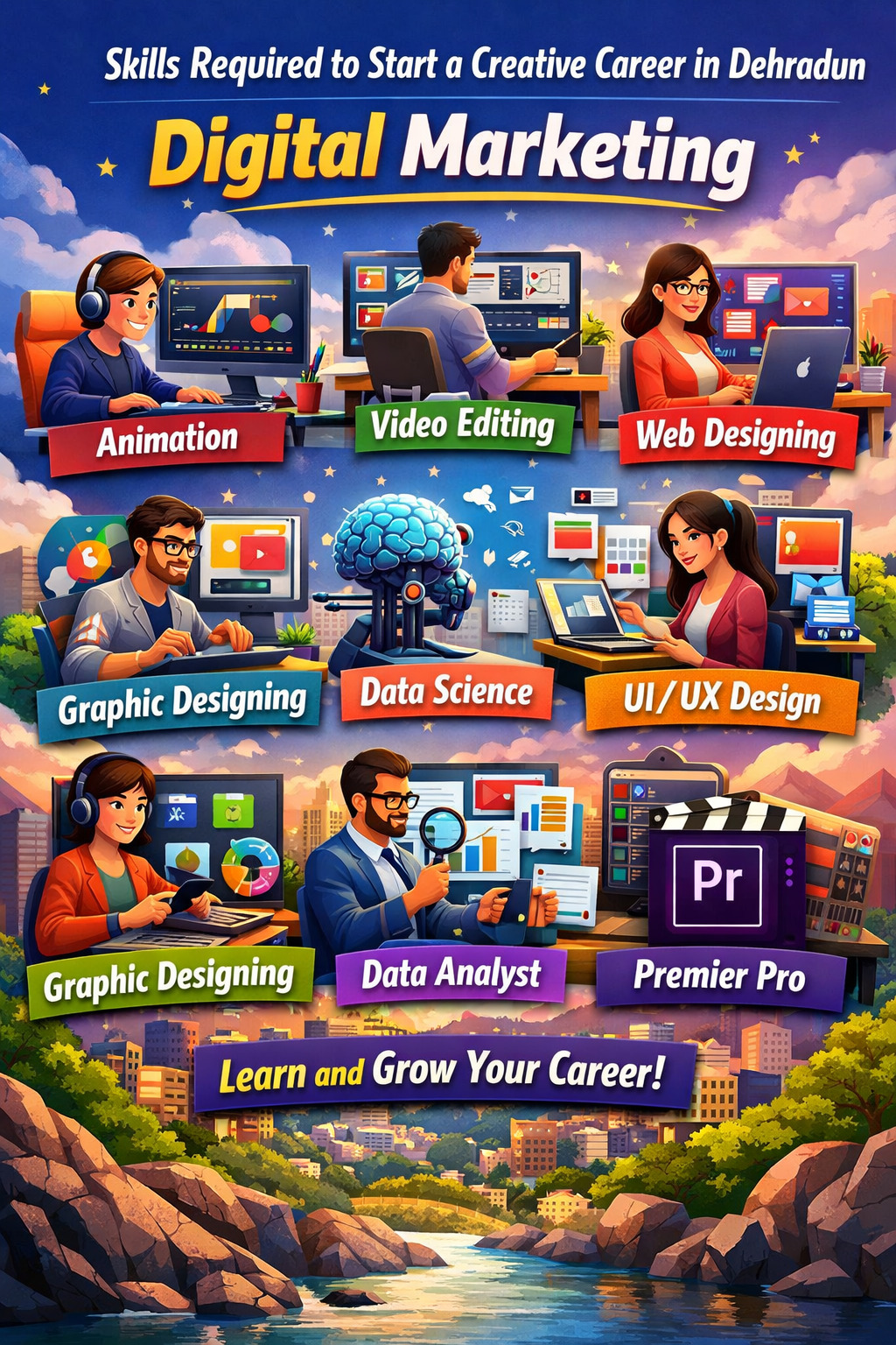 Starting a creative career in Dehradun is a smart choice in today’s digital era. The media and advertising industry is expanding rapidly, creating new job opportunities for skilled professionals. By learning in-demand skills like Digital Marketing, Python, Animation, Video Editing, Web Designing, UI/UX, Machine Learning, Graphic Designing, Data Analysis, and Premiere Pro, students can build a successful and future-proof career. If you focus on skill development and practical training, you can achieve both financial stability and creative satisfaction in this growing industry.