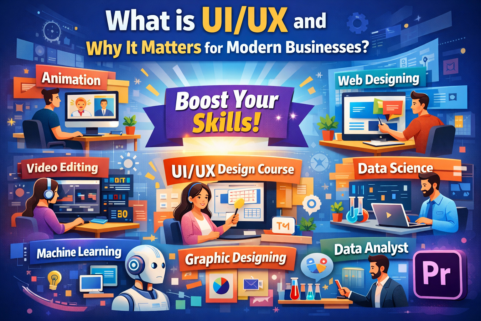 UI/UX design has become a key factor in the success of modern businesses. It helps create better user experiences, increases customer satisfaction, and improves overall business performance. Along with UI/UX, skills like Digital Marketing, Python, Animation, Video Editing, Web Designing, Machine Learning, Graphic Designing, Data Analysis, and Premiere Pro play a crucial role in building a strong digital presence.