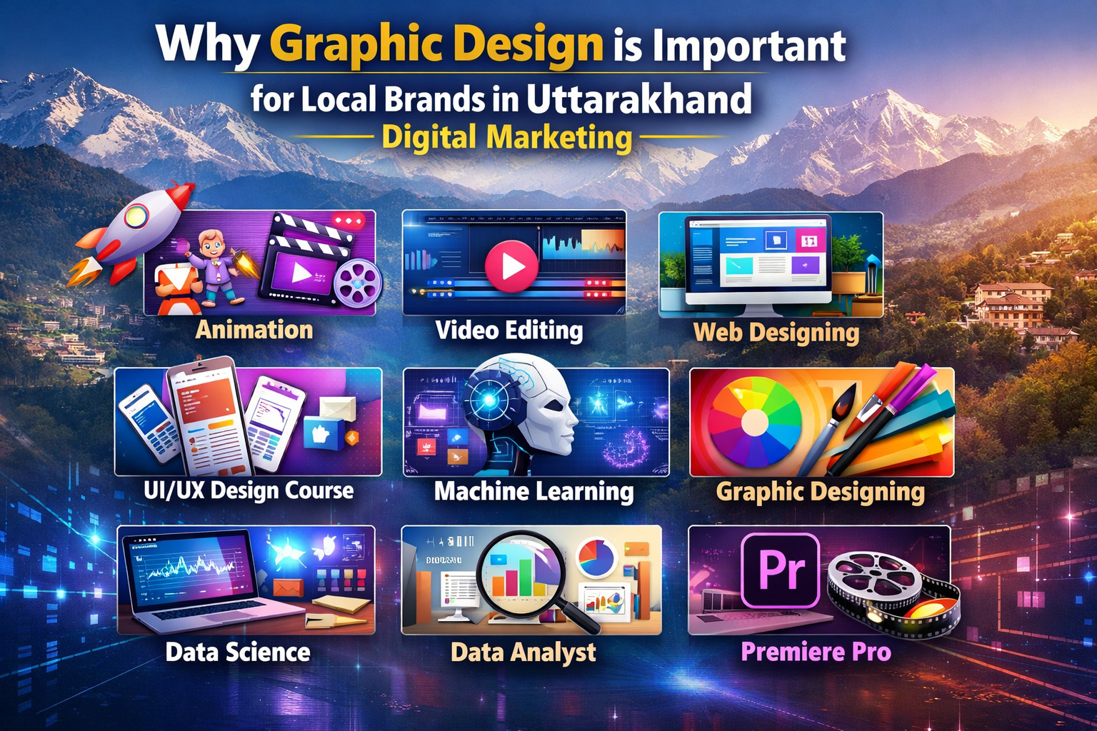 Graphic design has become a powerful tool for local brands in Uttarakhand to attract customers and build strong brand identities. As more businesses focus on digital marketing and online promotion, the demand for skilled designers and creative professionals continues to grow. Students who learn courses such as Digital Marketing, Python, Animation, Video Editing, Web Designing, UI/UX Design, Machine Learning, Graphic Designing, Data Analysis, and Premiere Pro can develop valuable skills and contribute to the growth of local businesses while building successful careers in the digital and creative industries.