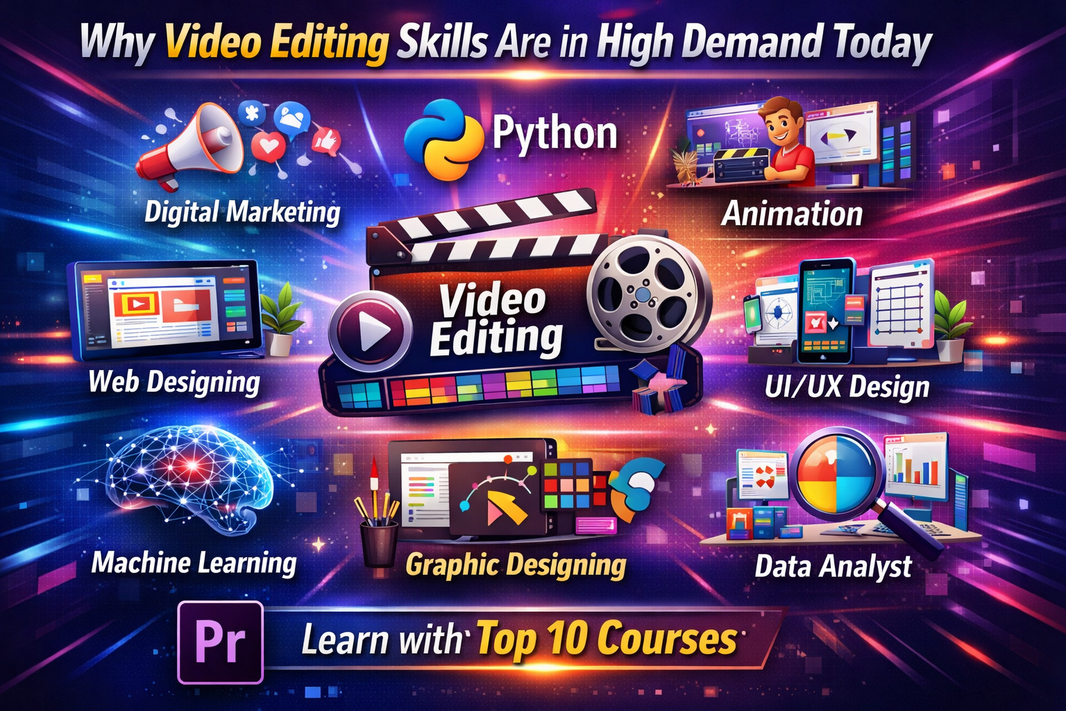 Video editing skills are in high demand because video content is becoming the most important form of communication in the digital world. From social media to business marketing and entertainment, video editors are needed everywhere. This career offers creativity, flexibility, and strong earning opportunities. By learning additional skills like Digital Marketing, Python, Animation, Web Designing, UI/UX Design, Machine Learning, Graphic Designing, Data Analysis, and Premiere Pro, students can boost their career growth and income potential. With the right training and consistent practice, video editing can lead to a successful and future-ready career.